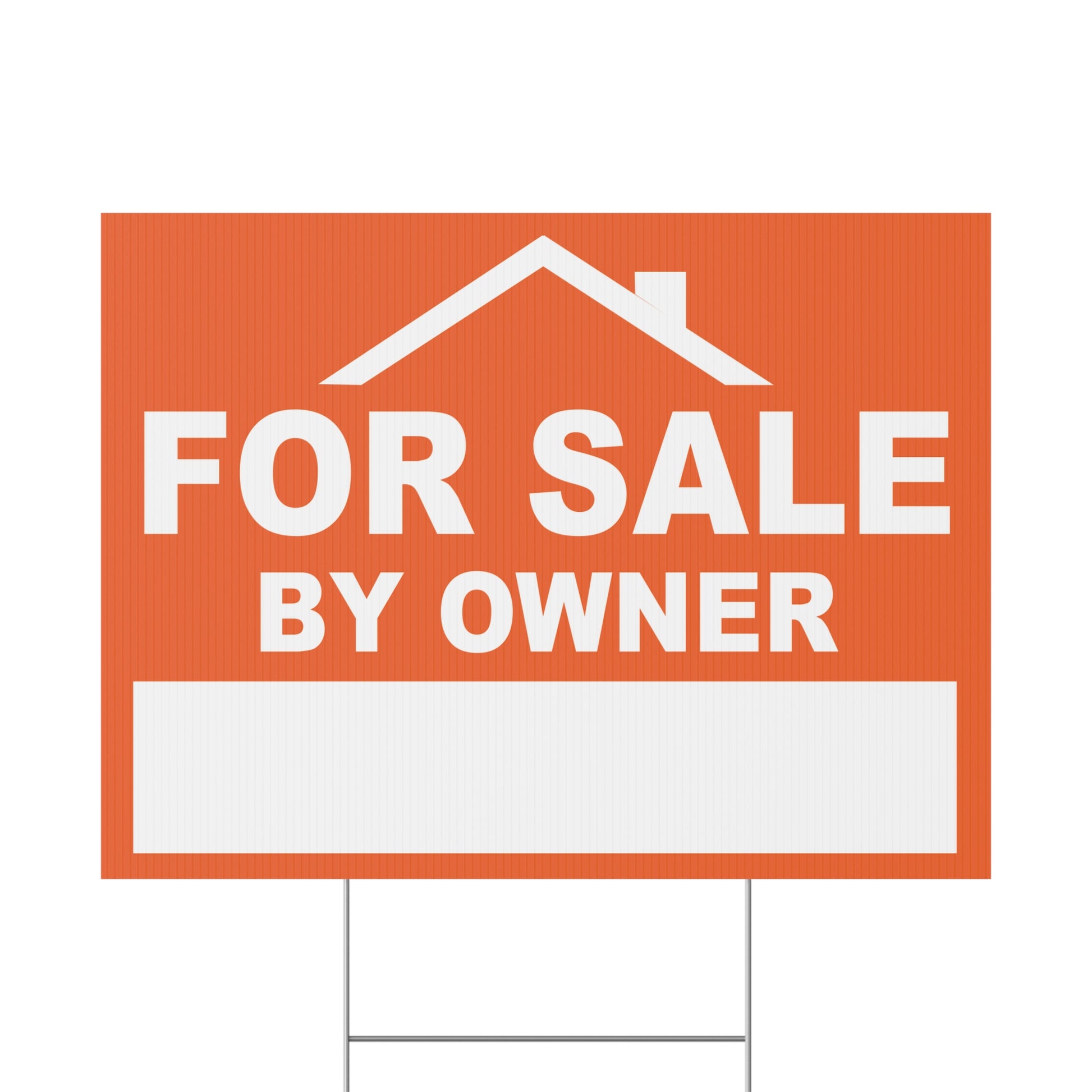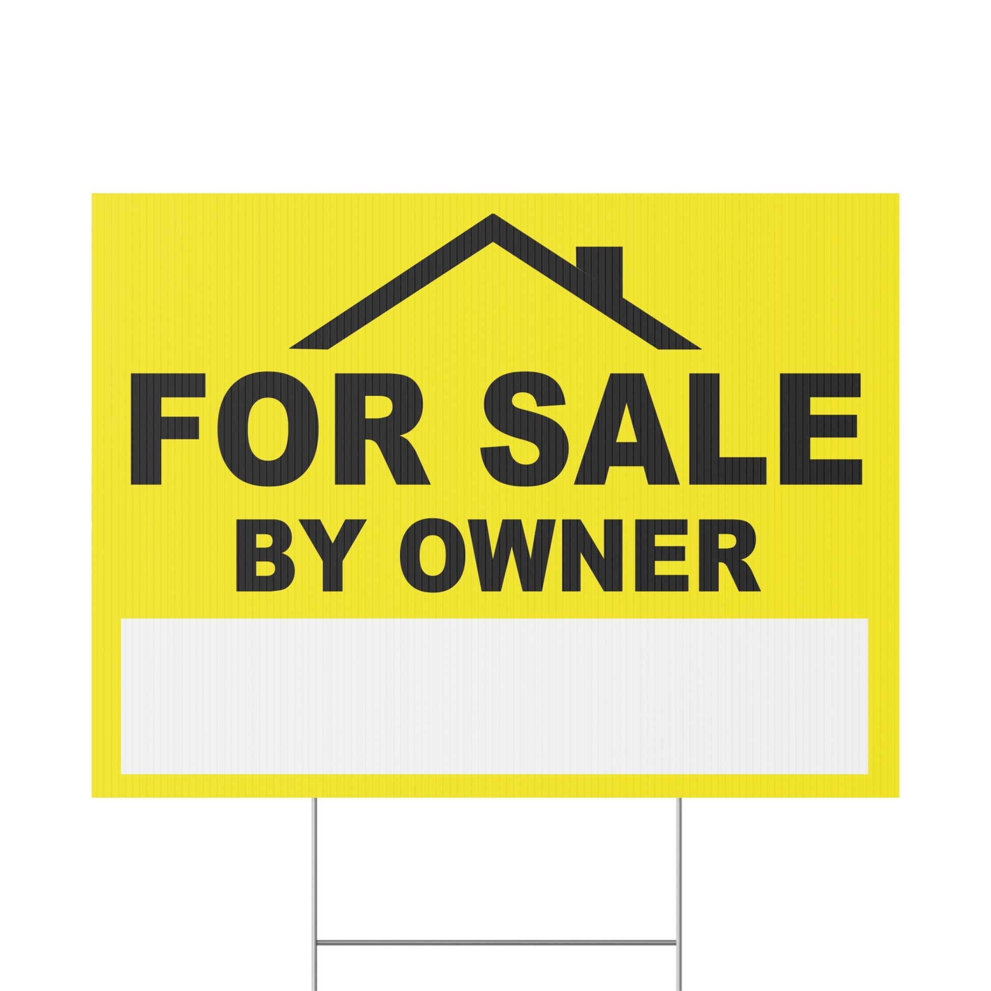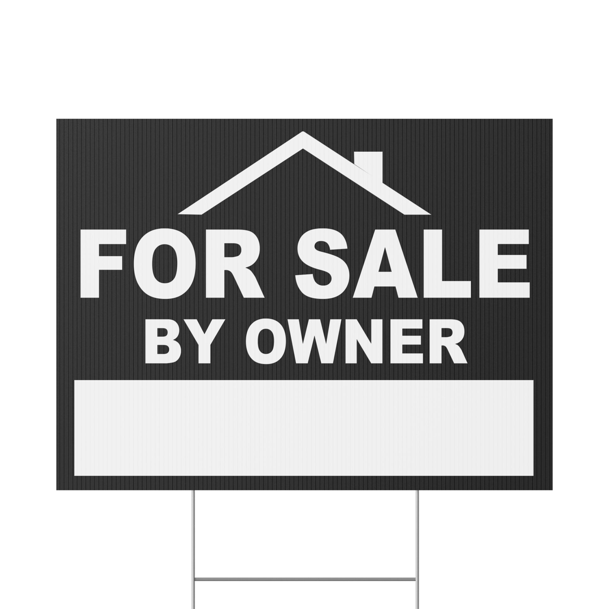 For Sale by Owner Yard Sign, Double Sided, Weatherproof, Includes H-Stakes. Multiple size choices, printed double sided, plastic outdoor weather resistant. Yard Sign includes Metal H-Stake. Quick shipping!